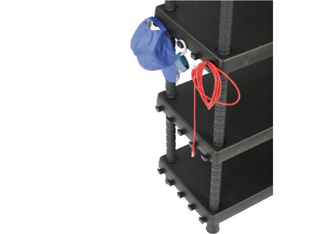 možnost až 40pozic výškového nastavení polic, extra vyztužený a robustní, 5 háčků na každé polici pro zavěšení věcí, možnost dokoupení samostatných polic, nosnost police 45kg, ideální pro použití ve vlhkých prostorách, uvnitř nebo venku. Nezadržuje pachy ani vlhkost, snadno se čistí, jednoduchá montáž bez nářadí.