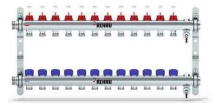 - na zpátečce s integrovanými termostatickými ventily pro uzavírání jednotlivých topných nebo chladicích okruhů, ruční modré krytky, připojovací závit M30x1,5 mm pro termopohony REHAU UNI