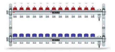 - na zpátečce s integrovanými termostatickými ventily pro uzavírání jednotlivých topných nebo chladicích okruhů, ruční modré krytky, připojovací závit M30x1,5 mm pro termopohony REHAU UNI