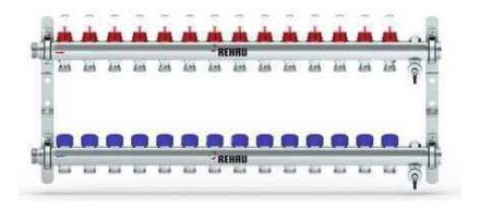 - na zpátečce s integrovanými termostatickými ventily pro uzavírání jednotlivých topných nebo chladicích okruhů, ruční modré krytky, připojovací závit M30x1,5 mm pro termopohony REHAU UNI