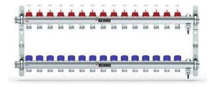 - na zpátečce s integrovanými termostatickými ventily pro uzavírání jednotlivých topných nebo chladicích okruhů, ruční modré krytky, připojovací závit M30x1,5 mm pro termopohony REHAU UNI