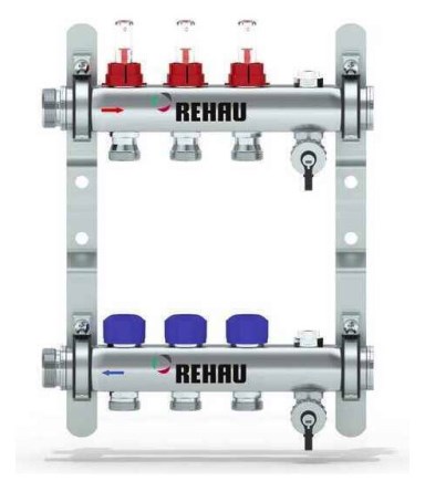 - na zpátečce s integrovanými termostatickými ventily pro uzavírání jednotlivých topných nebo chladicích okruhů, ruční modré krytky, připojovací závit M30x1,5 mm pro termopohony REHAU UNI