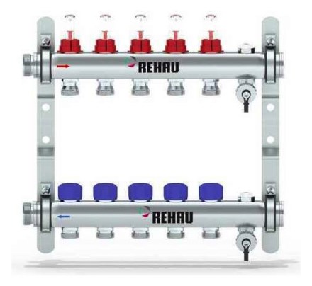 - na zpátečce s integrovanými termostatickými ventily pro uzavírání jednotlivých topných nebo chladicích okruhů, ruční modré krytky, připojovací závit M30x1,5 mm pro termopohony REHAU UNI