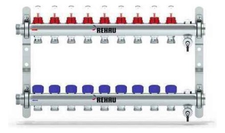 - na zpátečce s integrovanými termostatickými ventily pro uzavírání jednotlivých topných nebo chladicích okruhů, ruční modré krytky, připojovací závit M30x1,5 mm pro termopohony REHAU UNI