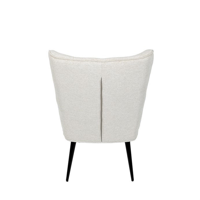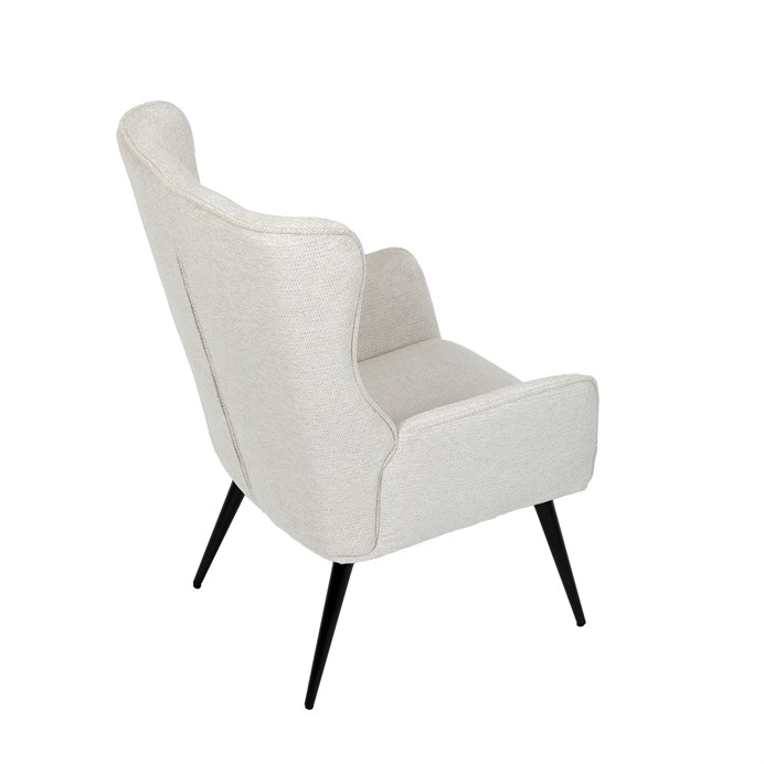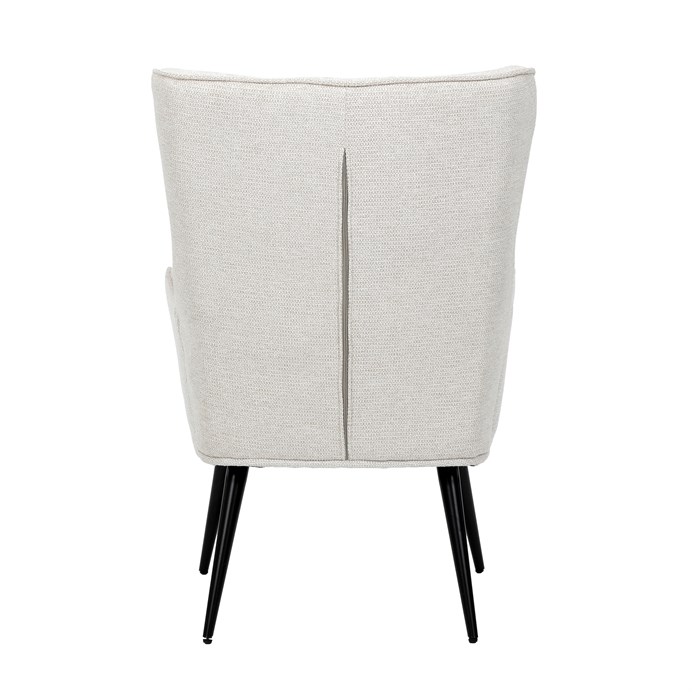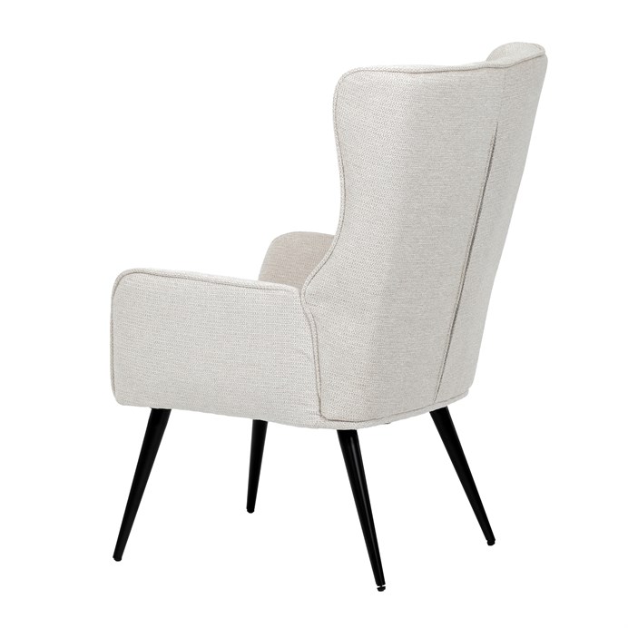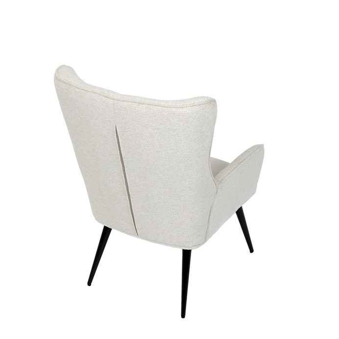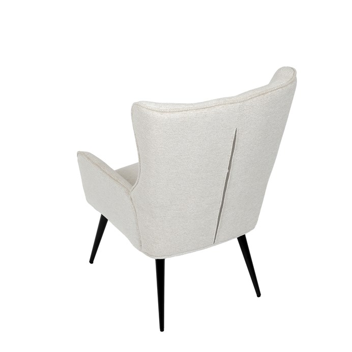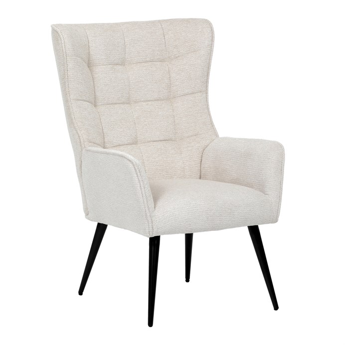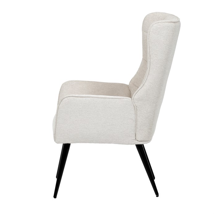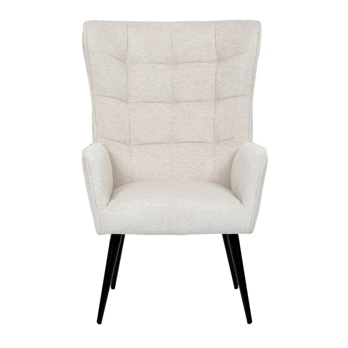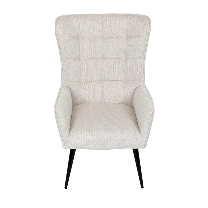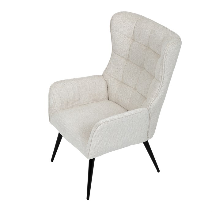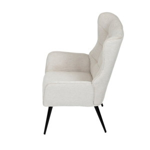 Křeslo s béžovým potahem z voděodolné látky kombinuje pohodlí s praktickým využitím v interiéru. Masivní nohy z kaučukovníku doplněné o kovové prvky zajišťují stabilitu a dlouhou životnost. Designové prošití na opěradle a sedáku podtrhuje moderní vzhled a zároveň přispívá k pevnosti čalounění. Područky jsou integrované do celkového tvaru křesla, což zvyšuje komfort při sezení. Díky použitým materiálům je křeslo vhodné pro každodenní relaxaci s důrazem na snadnou údržbu a odolnost vůči vlhkosti.