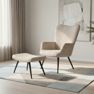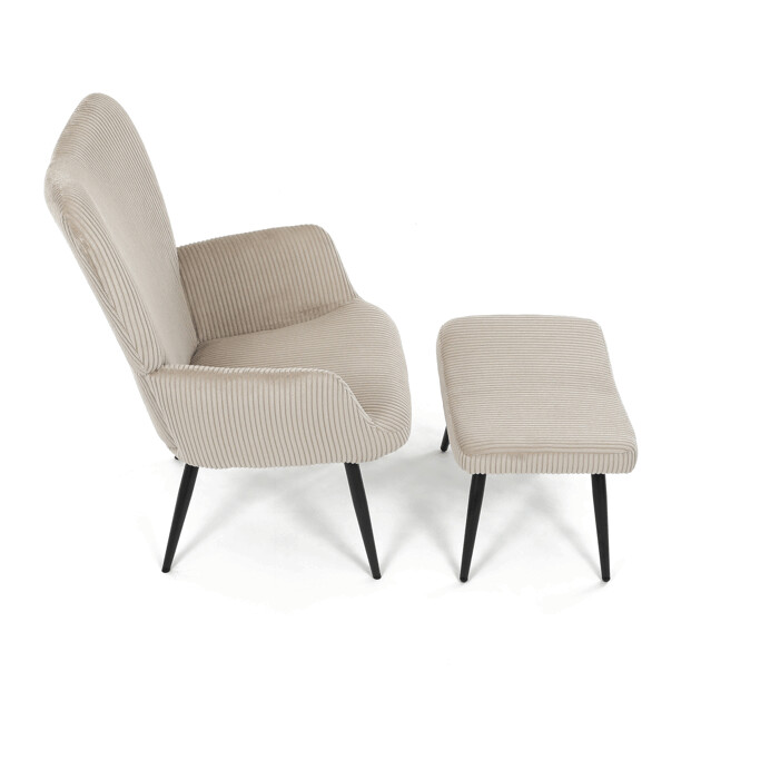 Relaxační křeslo s podnožkou v béžovém manšestru nabízí pohodlné posezení s dostatečnou oporou díky čalouněným područkám a vysokému opěradlu. Potah z manšestrové látky přináší příjemnou texturu a vizuální efekt, který podtrhuje útulný charakter křesla. Stabilní černé kovové nohy zajišťují pevnost a dlouhou životnost, přičemž taburet slouží jako praktický doplněk pro odpočinek nohou. Křeslo není otočné ani rozkládací, což podtrhuje jeho jednoduchost a funkčnost v interiéru. Díky svým rozměrům a designu je vhodné do obývacích pokojů i relaxačních zón.