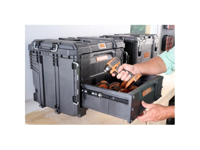 Box je vybaven 2 prostornými zásukami s nosností až 10 kg, které poskytují dostatek prostoru na vaše nářadí a další dílenské pomůcky. Jejich celková kapacita činí 28 litrů. Na přední straně naleznete oranžové popisovací štítky, díky nimž vždy budete vědět co máte ve které zásuvce uložené. Jedna zásvuka je navíc vybavena rozdělovacími přepážkami pro ještě lepší organizaci drobnějších součástkech. Zásvuky jsou ošetřeny bezpečnostními zarážkami zabraňujícími jejich nechtěnému vysunutí.