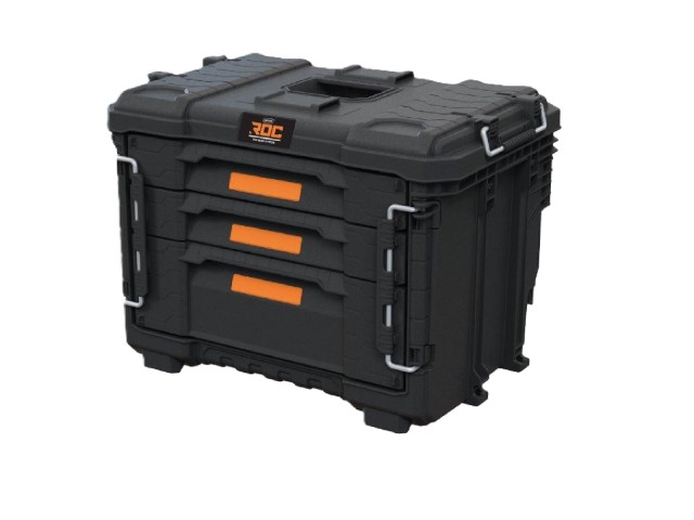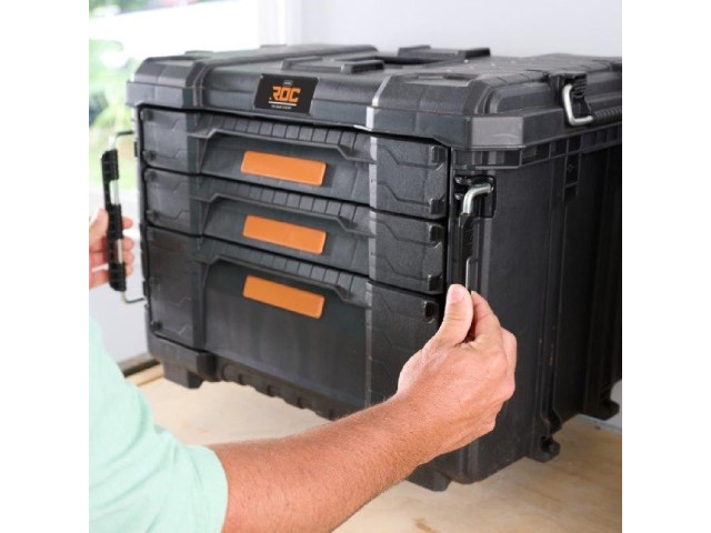 Box na nářadí ROC Pro Gear 2.0, 3 zásuvky - 2 mělké, 1 hlubší, nosnost 20 kg, oranžové štítky na zásuvkách k nadepsání obsahu, bezpečnostní zarážky proti nechtěnému otevření zásuvek, boxy z modelové řady se mohou skládat na sebe a zajišťovat odolnými západkami, jsou uzamykatelné visacím zámkem (ten není součástí balení), boční madla pro snažší manipulaci. Rozměry: 56,5 x 37,5 x 41,3 cm (š x d x v).