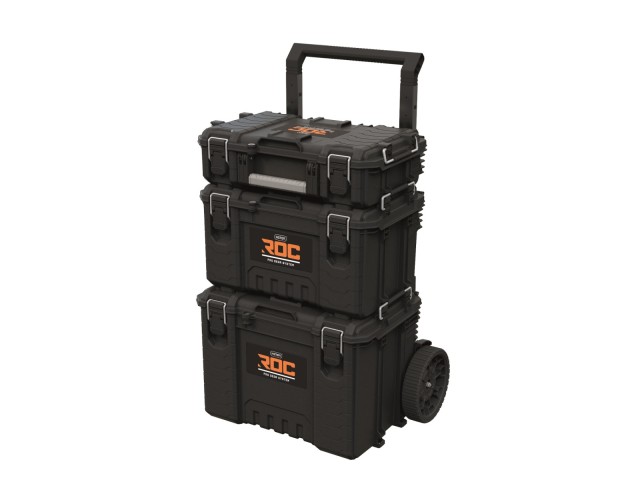 Mobilní sestava boxů na nářadí ROC Pro Gear 2.0, 9" kolečka, odnímatelná náprava, teleskopická rukojeť s měkkým úchopem, modulární systém, krytí IP65, odolné západky pro bezpečné uzavření, možnost uzamčení visacím zámkem (není součástí balení), ergonomické boční úchyty, Rozměry: 64,8 x 47,8 x 87,2 cm (š x h x v), objem 111 l, nosnost 80 kg.
