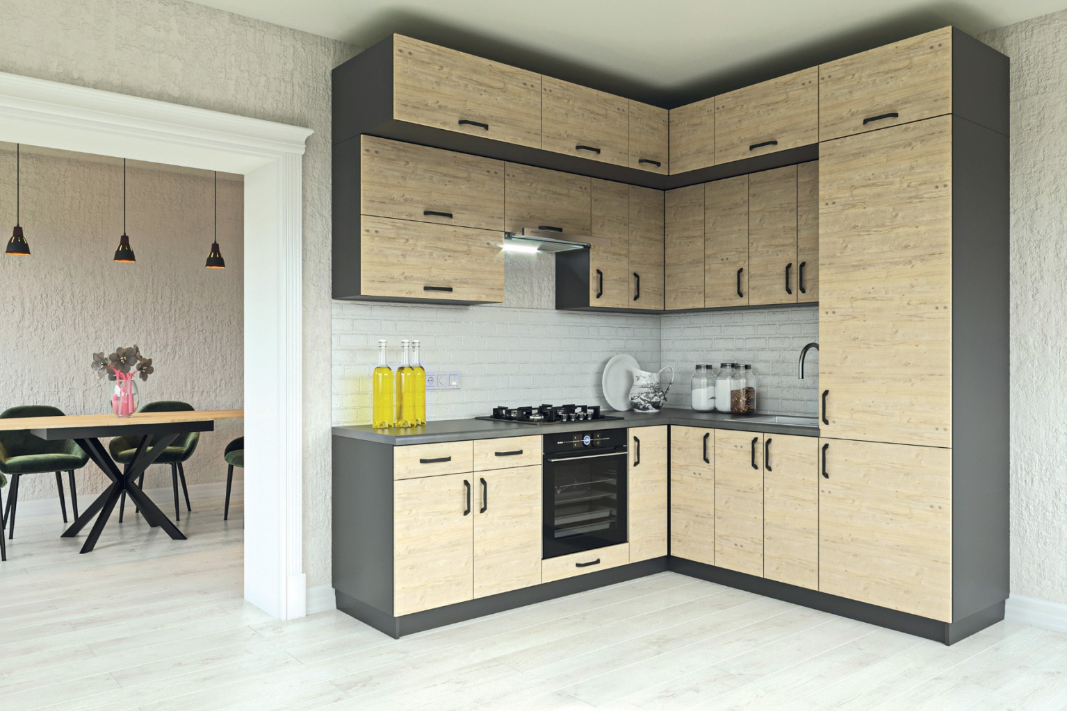 Dotaz na produkt Na splátky ještě dnesRohová kuchyňská linka 230x230x250 s velkým množstvím úložného prostoru.