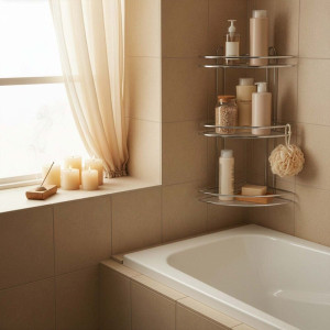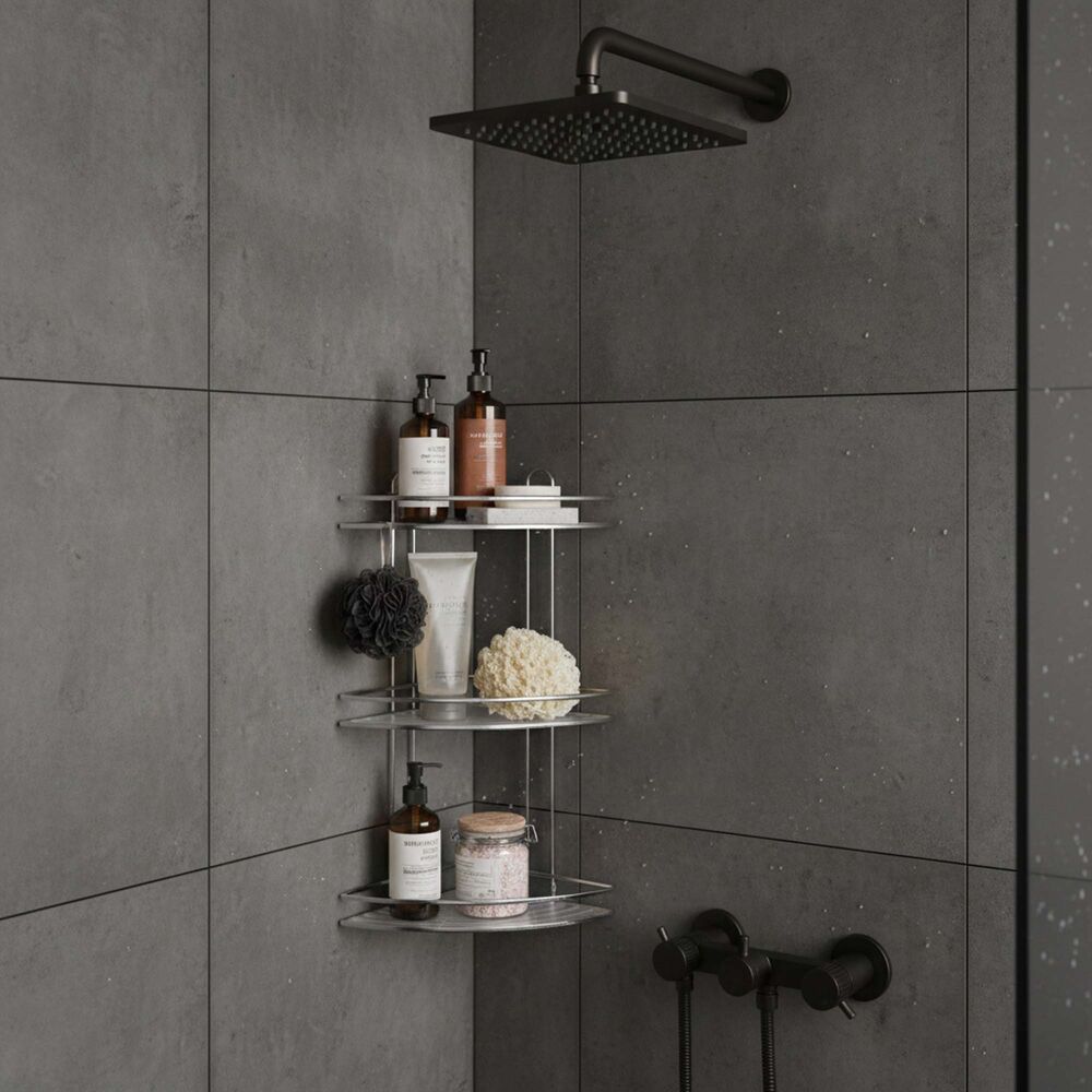 Stříbrná rohová polička skvěle využije prostor v koupelně a nabídne tři úrovně pro uspořádání kosmetiky i doplňků. Kovová konstrukce působí elegantně, je odolná a díky otevřenému designu umožňuje rychlé vysychání. Instalace je jednoduchá díky přiloženým montážním prvkům. Praktické rozvržení, stabilní provedení a nadčasový vzhled dodají koupelně styl i pořádek.