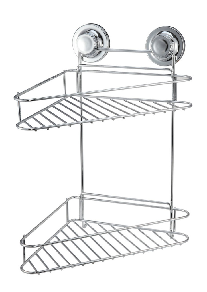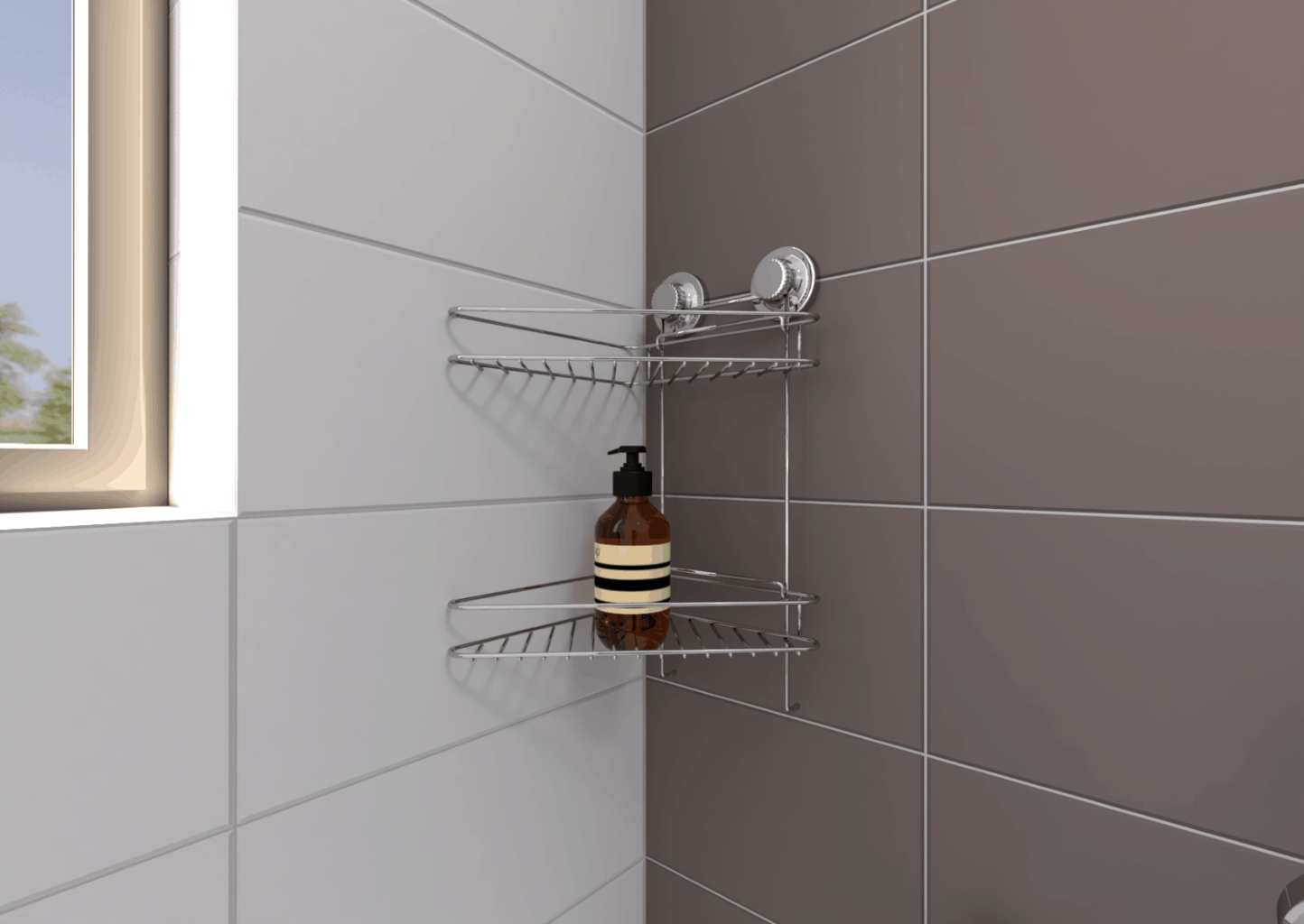 Nástěnná dvoupatrová rohová polička Ecoloc nabízí snadnou a rychlou instalaci bez vrtání.