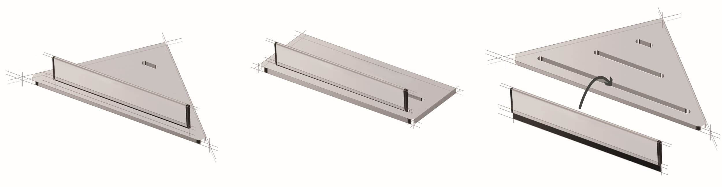Jedná se o 4 typy poliček vyrobených z akrylátu o síle 8 mm, všechny 4 typy nabízíme ve dvou barvách: matné bílé a matné černé. K tomu dva typy úchytů - minimalistický moderní úchyt a úchyt kulatý. Úchyty nabízíme hned ve třech barvách: chrom, černý mat a PVD gun metal.