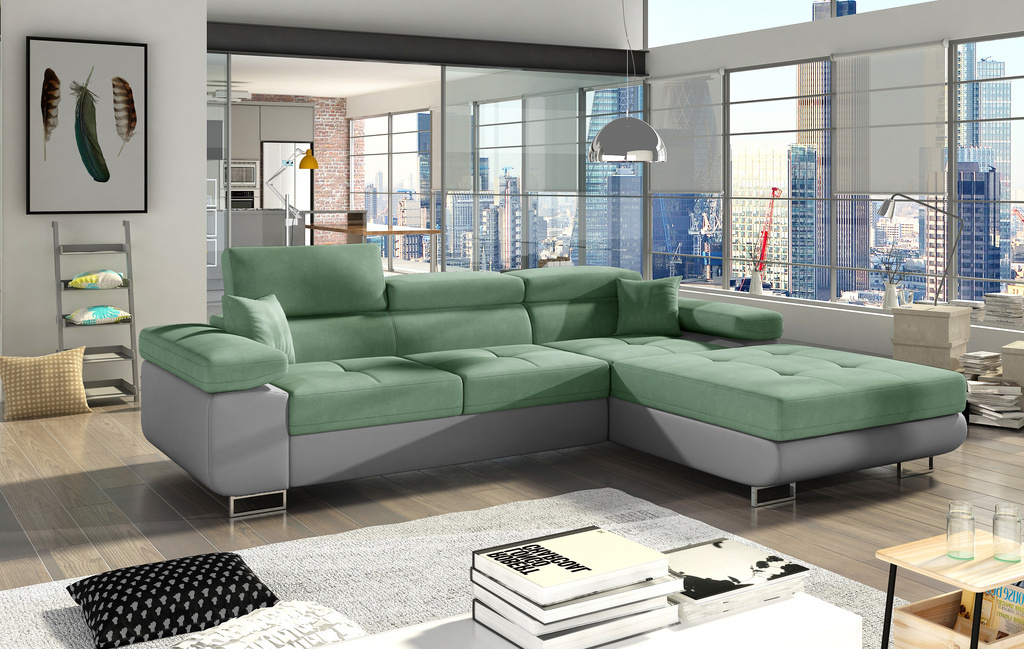 Rohová sedací souprava vyrobena z kvalitních materiálů poskytuje pohodlné posezení u televize a zároveň se díky zajímavému modernímu designu stane dominantou každého obývacího pokoje. Konstrukce soupravy je vyrobena z kombinace dřeva a dřevotřískové desky a výplň sedáků tvoří polyuretanová pěna T3030. Pohovku lze navíc rozložit a vytvořit tak spací plochu o rozměrech 125 x 198 cm vhodnou pro příležitostné přespání.