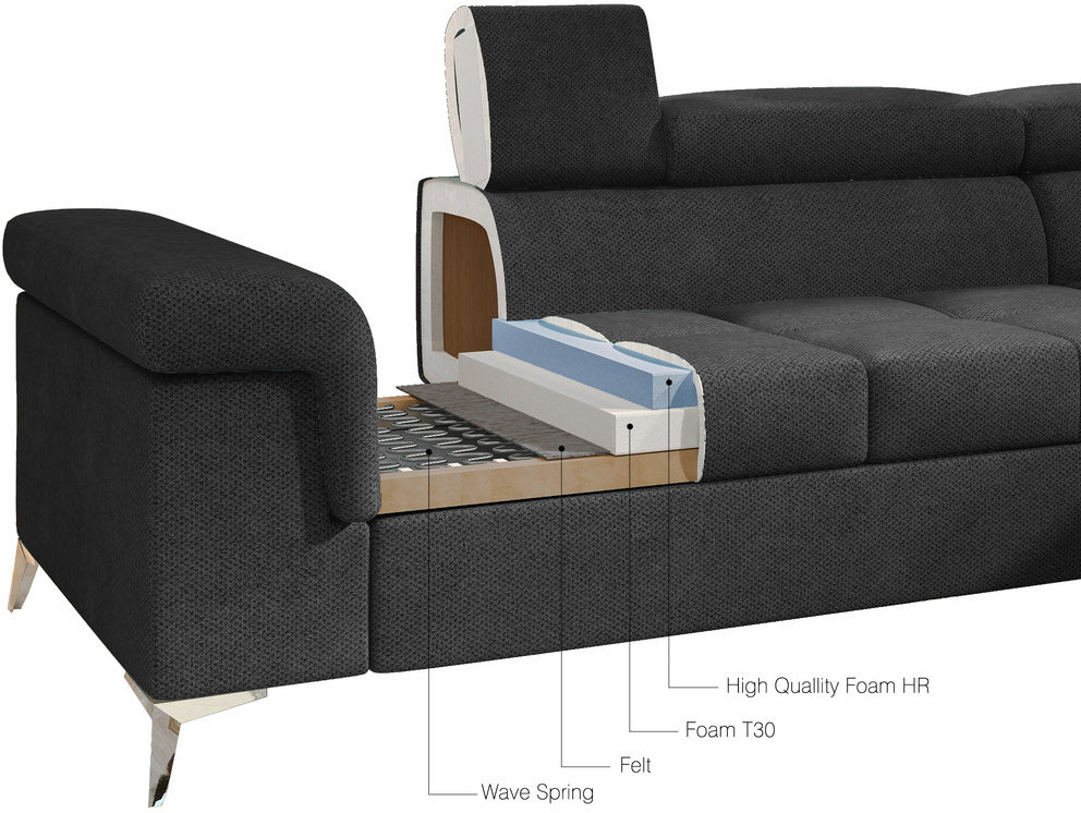 Rohová sedací souprava vyrobena z kvalitních materiálů poskytuje pohodlné posezení u televize a zároveň se díky zajímavému modernímu designu stane dominantou každého obývacího pokoje. Konstrukce soupravy je vyrobena z kombinace dřeva a dřevotřískové desky a výplň sedáků tvoří polyuretanová pěna T3030. Pohovku lze navíc rozložit a vytvořit tak spací plochu o rozměrech 125 x 193 cm vhodnou pro příležitostné přespání.