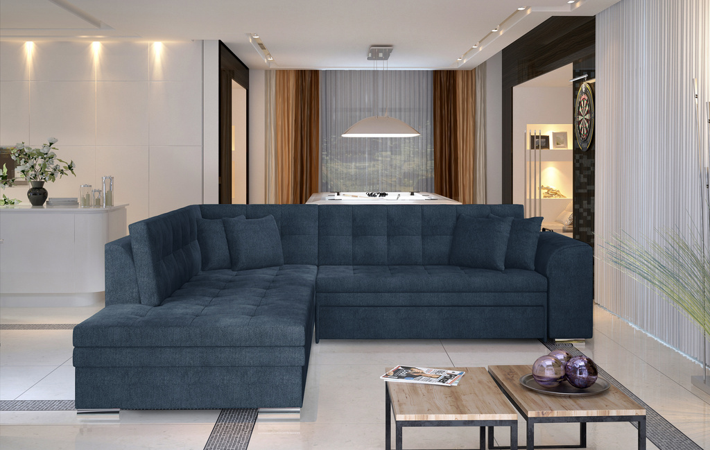 Rohová sedací souprava vyrobena z kvalitních materiálů poskytuje pohodlné posezení u televize a zároveň se díky zajímavému modernímu designu stane dominantou každého obývacího pokoje. Konstrukce soupravy je vyrobena z kombinace dřeva a dřevotřískové desky a výplň sedáků tvoří polyuretanová pěna s pružinami typu Bonel. Pohovku lze navíc rozložit a vytvořit tak spací plochu o rozměrech 126 x 200 cm vhodnou pro příležitostné přespání.