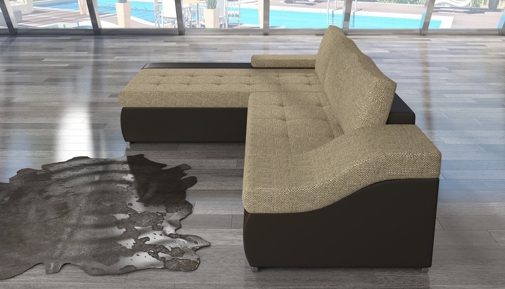 Rohová sedací souprava vyrobena z kvalitních materiálů poskytuje pohodlné posezení u televize a zároveň se díky zajímavému modernímu designu stane dominantou každého obývacího pokoje. Konstrukce soupravy je vyrobena z kombinace dřeva a dřevotřískové desky a výplň sedáků tvoří polyuretanová pěna s pružinami typu Wave. Pohovku lze navíc rozložit a vytvořit tak spací plochu o rozměrech 225x122cm vhodnou pro příležitostné přespání.