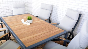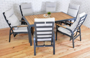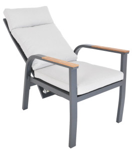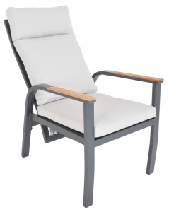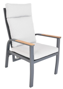 Luxusní hliníková křesla v grafitovém provedení, doplněna o teakové područky. Velmi pohodlné podušky z polyesteru (250g/m2) a vodoodpudivé předené tkaniny s molitanovou výplní (opěradlo 10 cm, sedák 5 cm) jsou odolné UV záření. Všechny podušky jsou vybaveny zipy, díky kterým můžete polyesterový potah jednoduše sundat. Velkou výhodou jsou vysoké opěrky křesel, které je navíc možné polohovat. Díky tomu nabízí prostor nejen ke stolování, ale i k velmi pohodlné relaxaci. Křesla mají díky použitým materiálům a modernímu vzhledu opravdu široké využití, jsou vhodná pro vnitřní i venkovní prostory - zahrady, terasy, zimní zahrady nebo třeba do uvítací haly či recepce. Díky jednoduché montáži, budete moci již po chvíli křesla naplno využívat.