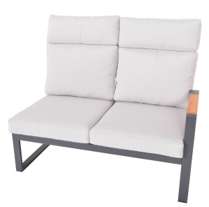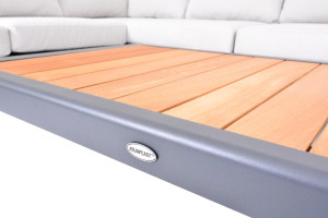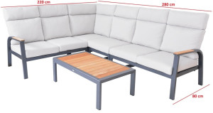 Luxusní hliníková souprava v grafitovém provedení, doplněna o teakové područky a desku stolu. Moderní souprava, která skvěle zapadne do každého exteriéru či interiéru. Pohodlné podušky z polyesteru (250g/m2) s molitanovou výplní (10 cm) jsou odolné UV záření. Všechny podušky jsou vybaveny zipy, díky kterým můžete polyesterový potah jednoduše sundat. Souprava má díky použitým materiálům a modernímu vzhledu opravdu široké využití, je vhodná pro vnitřní i venkovní prostory - zahrady, terasy, zimní zahrady nebo třeba do uvítací haly či recepce. Díky jednoduché montáži, budete moci již po chvíli soupravu naplno využít. Mezikus je možné umístit na levou nebo pravou stranu a tím pozměnit délku pravé či levé části dle vaší potřeby. Celková nosnost rohového sofa 800 kg (2x dvojsedák sofa = 2x 250 kg, 1x rohový kus = 150 kg, 1x mezikus = 150 kg).