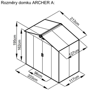 Dotaz na produkt Na splátky ještě dnesZahradní domek ARCHER využijete pro uskladnění např. zahradního nářadí, jízdního kola, sekačky, příslušenství k bazénu atd. Zahradní domek v moderním designu se hodí do každé zahrady. Domek má dvojité posuvné dveře, tudíž do něj budete mít pohodlný přístup. Rozměr dveří: 96x162 cm. Vyroben z kvalitních žárově pozinkovaných ocelových plechů tloušťky 0,25-0,30 mm a kvalitního rámu zpozinkované oceli tloušťky 0,5-0,8 mm. Maximální zatížení střechy sněhem je 60 kg/m2. Ocelová, pozinkovaná konstrukce s ventilačními mřížkami. Podlaha není součástí domku. Domek je zapotřebí postavit na rovném základu (beton, dlaždice, dřevěná podlaha). Součástí domku je obvodový rám, který kotevními šrouby připevníte k rovnému podkladu. Kotevní materiál je také součástí balení.