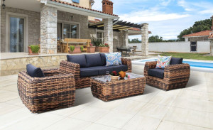 Luxusní sestava nábytku z umělého ratanu a hliníkové kostry. I když se umělý ratan podobá přírodnímu, je mnohem odolnější. Obecně lze říci, že je pružnější a je méně pravděpodobné, že se poničí.Umělý zahradní ratanový nábytek vyniká snadnou údržbou a velkou odolností vůči nepřízni počasí. Umělý ratanový nábytek se neloupe, nevznikají na něm nevzhledné praskliny, je stálobarevný po mnoho let. Jestliže nechcete mít obývací pokoj laděný ve stejném duchu jako ostatní, ratanový nábytek je možným řešením, jak se odlišit i v interiéru.Luxusní polyratanový nábytek má opravdu velmi široké využití. Je vhodný pro vnitřní i venkovní prostory, zahrady, terasy, zimní zahrady, balkony, kanceláře, jednací místnosti, recepce a další nebytové i bytové prostory. Nemusíte nic skládat ani montovat - nábytek je již připraven k okamžitému použití. Podušky jsou odnímatelné. Luxusní souprava z kvalitního umělého ratanu, který odolává UV zářenía teplotě od +50°C do -10°C.Kostra je hliníková + prášková barva.Ratan: 15x7mmDeska stolu: 5mm tvrzené skloPodušky:výplň-14 cm molitan, látka- polyester Podušky na sedací části jsou vybaveny zipem, což umožňuje snadné praní povlaku. Zádové podušky jsou prošité knoflíky a nelze povlak sejmout.