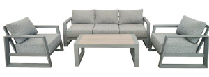 Luxusní souprava s hliníkovou konstrukcí, která je pokryta práškovou barvou. Moderní design.Podušky: výplň-20 cm molitan, látka- polyester. Podsedáky i polštáře jsou vybaveny zipy, takže je možné potah sundat. Deska stolu vyrobena z polywoodu. Souprava má opravdu velmi široké využití. Je vhodná pro vnitřní i venkovní prostory, zahrady, terasy, zimní zahrady či balkony.Jednoduché sestavení a složení.