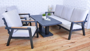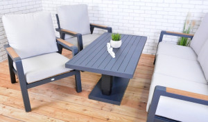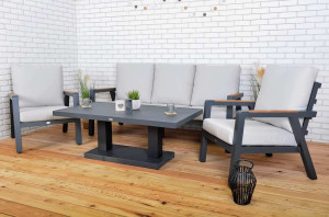 Luxusní hliníková souprava v grafitovém provedení, doplněna o područky z teakového dřeva. Součástí soupravy je i hliníkový stůl s nastavitelnou výškou desky stolu. Díky velmi jednoduchému ovládání snadno nastavíte na požadovanou výšku. Stůl tak můžete využít jako jídelní a popřípadě ho snížit a vytvořit stolek konferenční. Moderní souprava, která skvěle zapadne do každého exteriéru či interiéru. Pohodlné podušky z polyesteru (250g/m2) s molitanovou výplní (10 cm) jsou odolné UV záření. Všechny podušky jsou vybaveny zipy, díky kterým můžete polyesterový potah jednoduše sundat. Souprava má díky použitým materiálům a modernímu vzhledu opravdu široké využití, je vhodná pro vnitřní i venkovní prostory - zahrady, terasy, zimní zahrady nebo třeba do uvítací haly či recepce. Díky jednoduché montáži, budete moci již po chvíli soupravu naplno využít. STŮL má 2 výškové polohy - 51 cm a 77 cm
