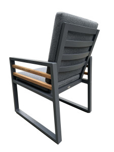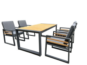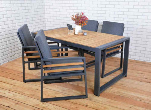 Luxusní hliníková souprava v grafitovém provedení, doplněna o dřevěné výplně z novozélandské borovice ošetřené pryskyřicí a voskovým olejem a stolovou desku z teaku. Moderní souprava, která skvěle zapadne do každého exteriéru či interiéru. Velmi pohodlné podušky z polyesteru (250g/m2) s molitanovou výplní (5 cm) jsou odolné UV záření. Všechny podušky jsou vybaveny zipy, díky kterým můžete polyesterový potah z vodoodpudivé předené tkaniny jednoduše sundat. Souprava má díky použitým materiálům a modernímu vzhledu opravdu široké využití, je vhodná pro vnitřní i venkovní prostory - zahrady, terasy, zimní zahrady nebo třeba do uvítací haly či recepce. Díky jednoduché montáži, budete moci již po chvíli soupravu naplno využít.