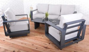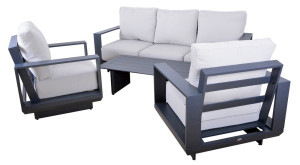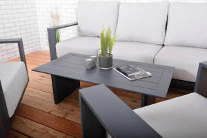Luxusní hliníková souprava v grafitovém provedení. Moderní souprava, která skvěle zapadne do každého exteriéru či interiéru. Velmi pohodlné podušky z polyesteru (250g/m2) s molitanovou výplní (20 cm) jsou odolné UV záření. Všechny podušky jsou vybaveny zipy, díky kterým můžete polyesterový potah z vodoodpudivé předené tkaniny jednoduše sundat. Souprava má díky použitým materiálům a modernímu vzhledu opravdu široké využití, je vhodná pro vnitřní i venkovní prostory - zahrady, terasy, zimní zahrady nebo třeba do uvítací haly či recepce. Díky jednoduché montáži, budete moci již po chvíli soupravu naplno využít.