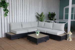 Luxusní hliníková souprava v grafitovém provedení, doplněna o stolovou desku z hliníku a pryskyřice v dezénu dřeva. Moderní souprava, která skvěle zapadne do každého exteriéru či interiéru. Velmi pohodlné vysoké podušky z předené tkaniny (polyester 460 g/m2) s molitanovou výplní. Všechny podušky jsou vybaveny zipy, díky kterým můžete polyesterový potah jednoduše sundat. Souprava má díky použitým materiálům a modernímu vzhledu opravdu široké využití, je vhodná pro vnitřní i venkovní prostory - zahrady, terasy, zimní zahrady nebo třeba do uvítací haly či recepce. Díky jednoduché montáži, budete moci již po chvíli soupravu naplno využít.