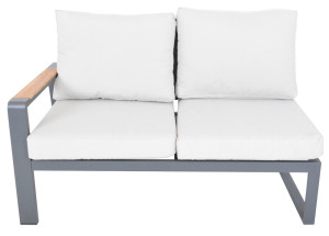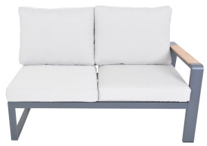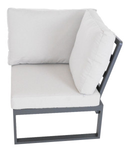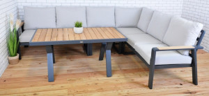 Luxusní hliníková souprava v grafitovém provedení, doplněna o teakové područky a desku stolu. Moderní souprava, která skvěle zapadne do každého exteriéru či interiéru. Pohodlné podušky z polyesteru (250g/m2) s molitanovou výplní (10 cm) jsou odolné UV záření. Všechny podušky jsou vybaveny zipy, díky kterým můžete polyesterový potah jednoduše sundat. Rozměry sedací podušky jsou šířka 65 cm, hloubka 65 cm a výška 11 cm, rozměry opěrkové podušky jsou šířka 65 cm, výška 48 cm a hloubka 13 cm. Souprava má díky použitým materiálům a modernímu vzhledu opravdu široké využití, je vhodná pro vnitřní i venkovní prostory - zahrady, terasy, zimní zahrady nebo třeba do uvítací haly či recepce. Díky jednoduché montáži, budete moci již po chvíli soupravu naplno využít. Mezikus je možné umístit na levou nebo pravou stranu a tím pozměnit délku pravé či levé části dle vaší potřeby. Celková nosnost rohového sofa 800 kg (2x dvojsedák sofa = 2x 250 kg, 1x rohový kus = 150 kg, 1x mezikus = 150 kg).