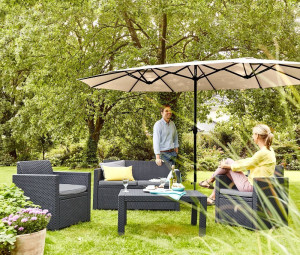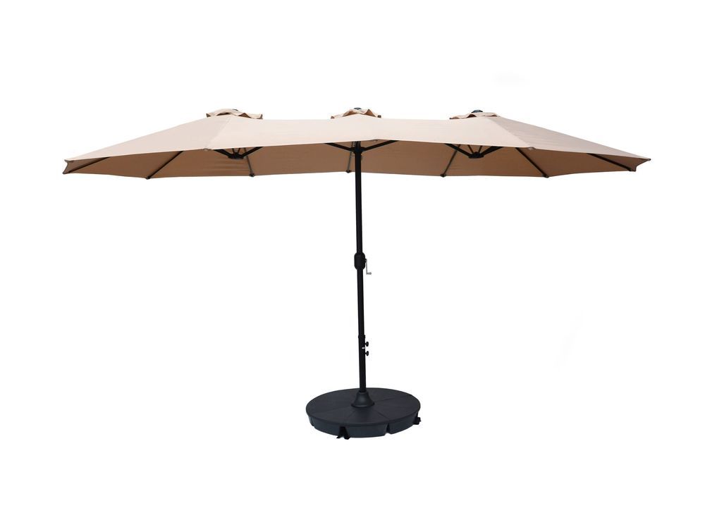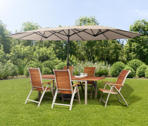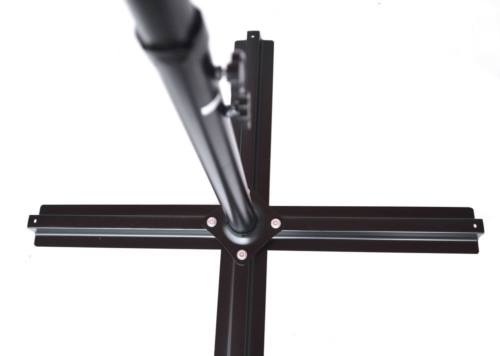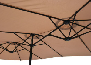 Dotaz na produkt Na splátky ještě dnesOpravdu velký, středový slunečník se dvěma rameny pro komfortní stínění oválného stolu. K otevírání slouží klička. Slunečník s moderním designem bez střapců. Součástí je i křížový podstavec, který je zapotřebí zatížit dlaždicemi.