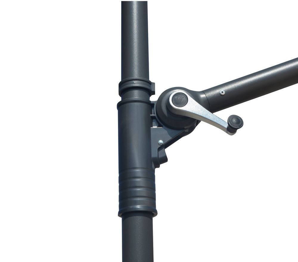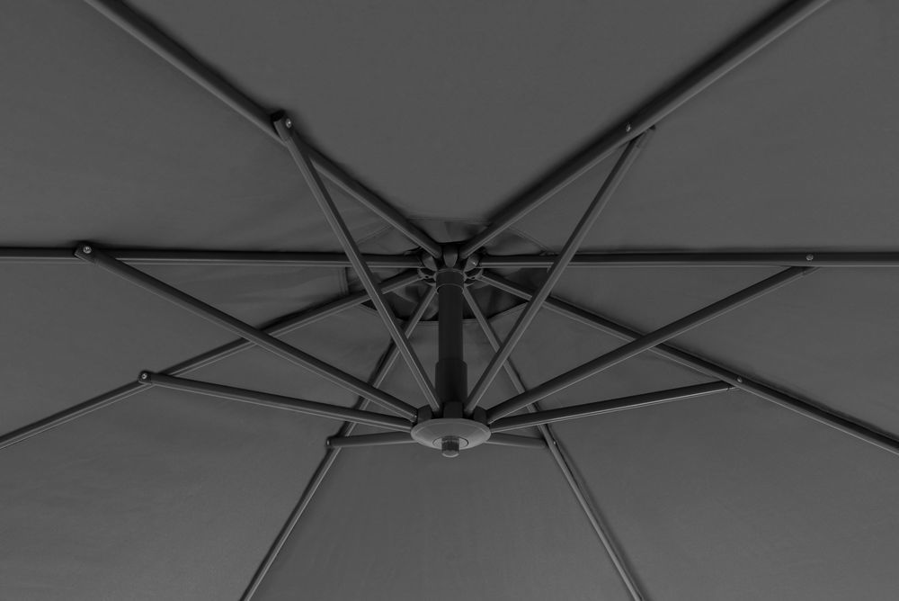 Osmiramenný BOČNÍ slunečník s moderním designem a pevnou konstrukcí. Součástí slunečníku je křížový podstavec, který je zapotřebí zatížit dlaždicemi. Slunečník se otevírá pomocí kličky. Lze u něho nastavit úhel stínění jednoduchým posunutím po stojné tyči. Zároveň je zde i možnost otáčení o 360° za pomoci pedálu. Potah má vodoodpudivý nástřik, který Vás ochrání před mírným deštěm. S PODSTAVCEM