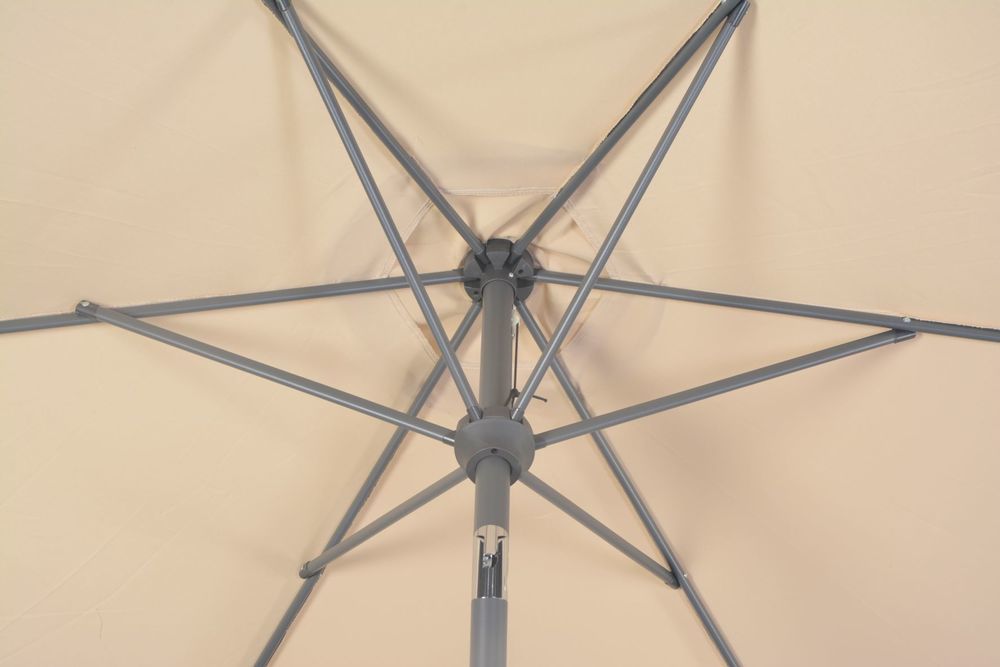 Šestiramenný naklápěcí slunečník s moderním designem a pevnou kovovou konstrukcí. Otevírání za pomoci designové kličky, potah má vodoodpudivý nástřik, takže Vás ochrání před mírným deštěm. BEZ PODSTAVCE