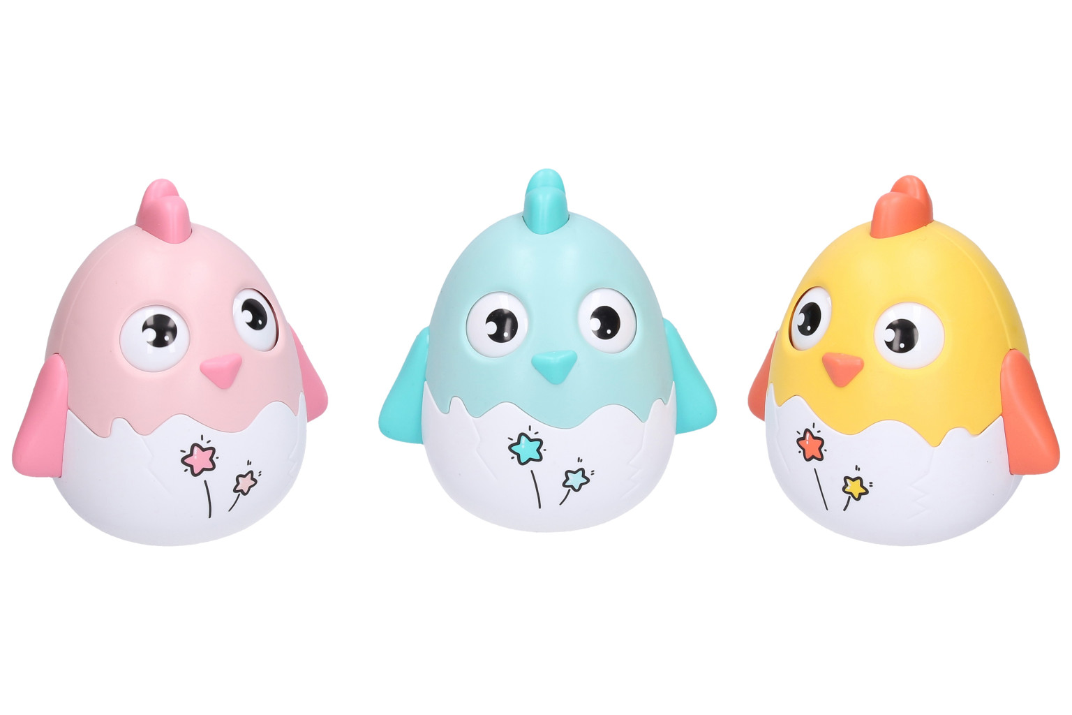 Dotaz na produktRoly poly kuře s rolničkami. Velikost 12x9x12 cm. Display box 9 ks. 3 varianty - žlutá, růžová, modrá.