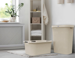 Dotaz na produktPlastový koš na prádlo ve styluratanového výpletu. Moderní design a kvalitní provedení. Objem 55L. Koš je vyrobenzodolného a pevnéhoplastu. Kvalitní zpracování od švýcarské značky Rotho.