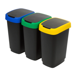 Dotaz na produktSet tří odpadkových košů TWIST 25L na třídění odpadu. Tento set usnadní recyklaci odpadu u vás domanebona pracovišti. Sada se skládá ze tří odpadkových košů s barevnými víky - barevně odlišené pro snadnější třídění. Objem jednoho koše je 25 litrů. Rozměr jednotlivého koše: 33 x 25 x 47 cm (d,š,v). Kvalitní materiál a provedení od švýcarské značky Rotho.
