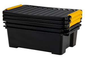 Dotaz na produktÚložný plastový box s víkem. Objem 30L. Moderní design a kvalitní provedení od švýcarské značky Rotho. Lesklá černá barva. Víko je opatřeno žlutými postranními úchyty pro bezpečné zaklapnutí. Boxy lze stohovat na sebe. Box lze pořídit i v praktické sadě 3 kusů.