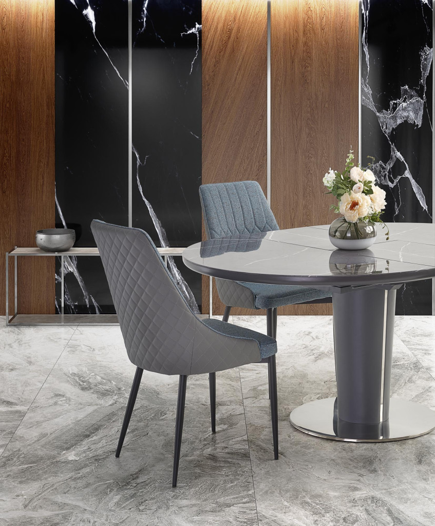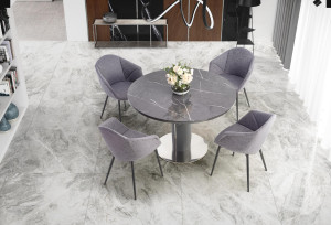 Jídelní stůl je vyroben v kombinaci skla, MDF a nerez.