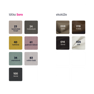 Možnost objednání ve 4 barevných provedeních ekokůže a v 7 barevných provedeních látky Soro v ceně 31.450 Kč. Svůj výběr poznamenejte do poznámky v objednávce. Při individuální objednávce je třeba zaplatit 20% zálohu z dané částky. Po uhrazení zálohy bude Váš požadavek zadán do výroby. Dodací lhůta 6-8 týdnů.