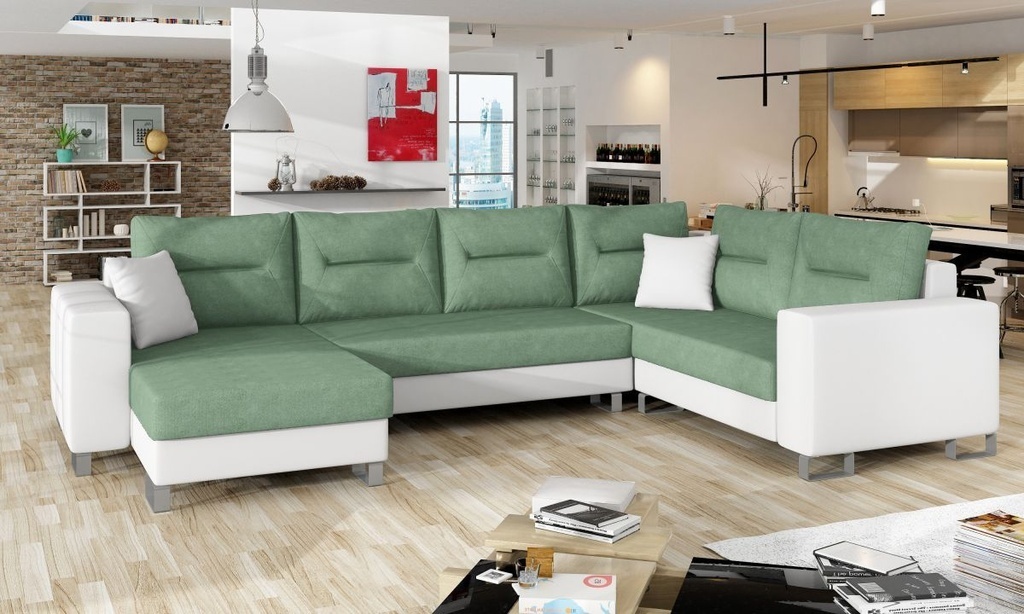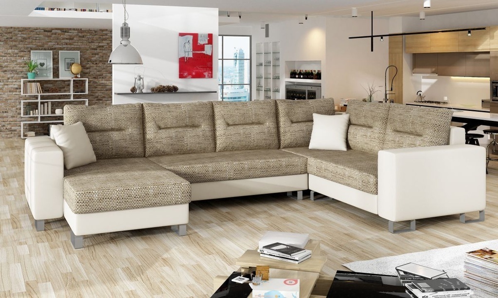 Rozkládací sedací souprava vyrobena z kvalitních materiálů poskytuje pohodlné posezení u televize a zároveň se díky zajímavému modernímu designu stane dominantou každého obývacího pokoje. Sedací souprava obsahuje úložné prostory a díky možnosti rozložení umožňuje příležitostné přespání. Konstrukce soupravy je vyrobena z kombinace dřeva a dřevotřískové desky a výplň sedáků tvoří polyuretanová pěna s pružinami typu Bonel.