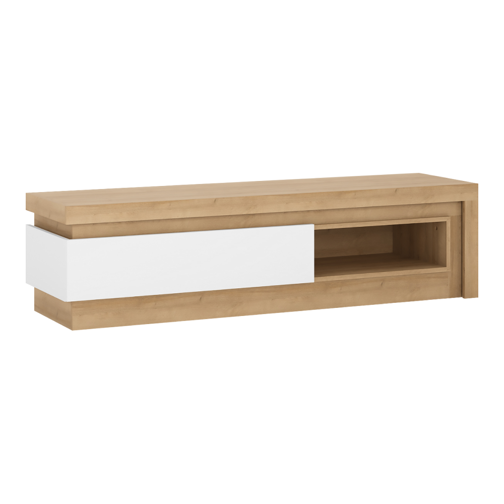 RTV stolek ze sektorové sestavy LEONARDO v provedení dub riviera / bílá s vysokým leskem.