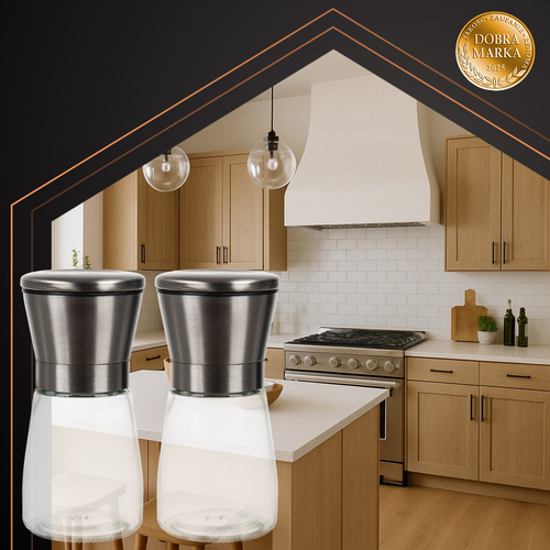 -sada 2 skleněných mlýnků s keramickým mechanismem – odolné, estetické a přesné, ideální pro sůl, pepř a bylinky
