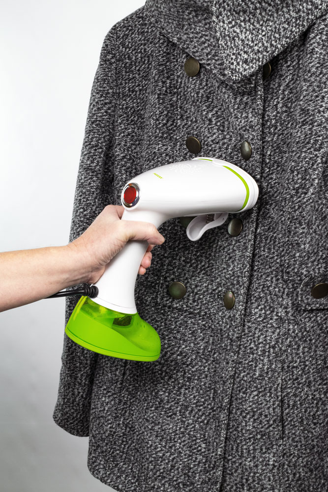 Ruční napařovač oděvů SteamPro jednoduše zapojíte do zásuvky a oblečení zavěšené na ramínku pomocí horké páry během několika málo vteřin narovnáte tak, aby na něm nebyly žádné viditelné záhyby.
