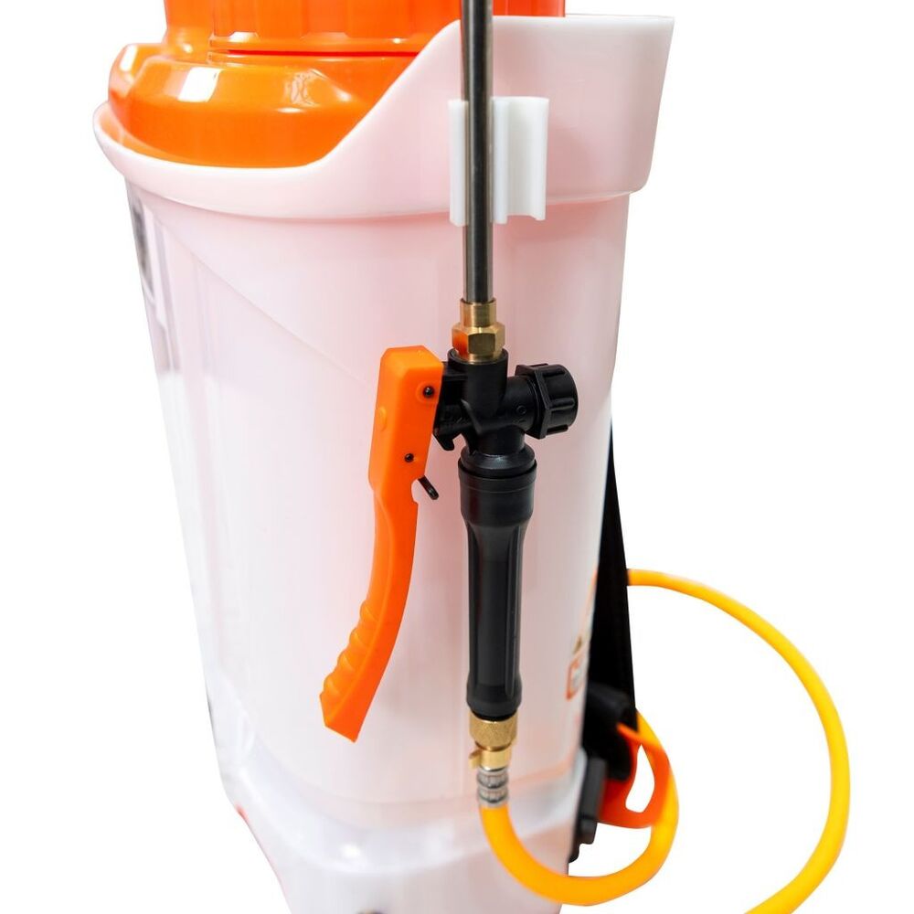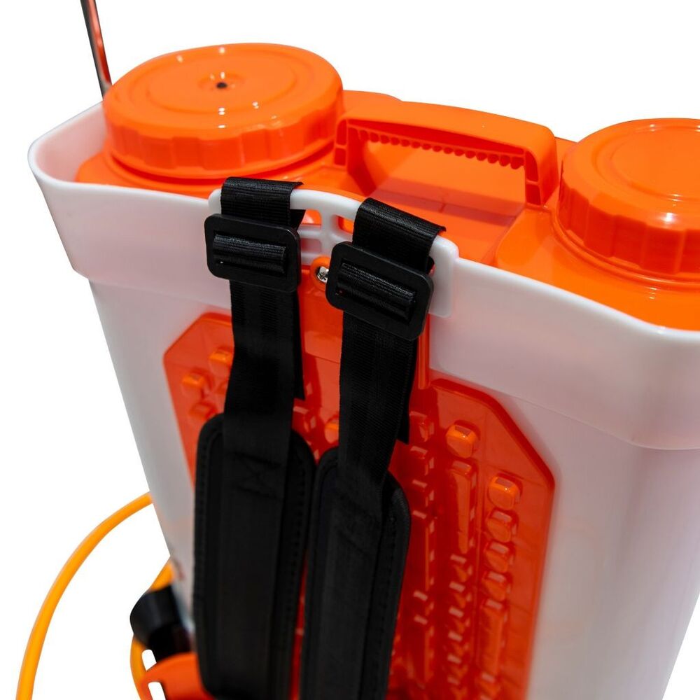 Výkonný motor zajišťuje konstantní tlak 6 barů, který je nezbytný pro rovnoměrné stříkání a hluboké pronikání látek. Další silnou stránkou postřikovače je měděný konektor hadice, který zabraňuje úniku kapaliny a zajišťuje pevné a odolné spojení. Postřikovač je vybaven funkcí automatického míchání, která se aktivuje pouhým stisknutím tlačítka. Tato funkce udržuje homogenní koncentraci roztoku v nádrži. Postřikovač má vysokopevnostní podpůrné popruhy, které poskytují stabilitu, odolnost a vyvážené rozložení hmotnosti na ramena, čímž snižují únavu během používání.