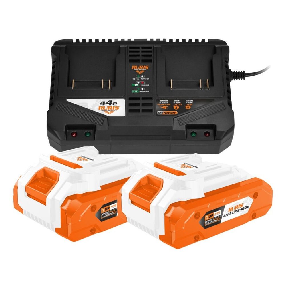 Sada dvou akumulátorů a dvojité nabíječky RURIS Alfa UP 4444e má napětí 20 V a kapacitu 4 Ah. Inovace Ruris Alfa Up umožňuje restart baterie i po delším skladování mezi 6 až 12 měsíci.