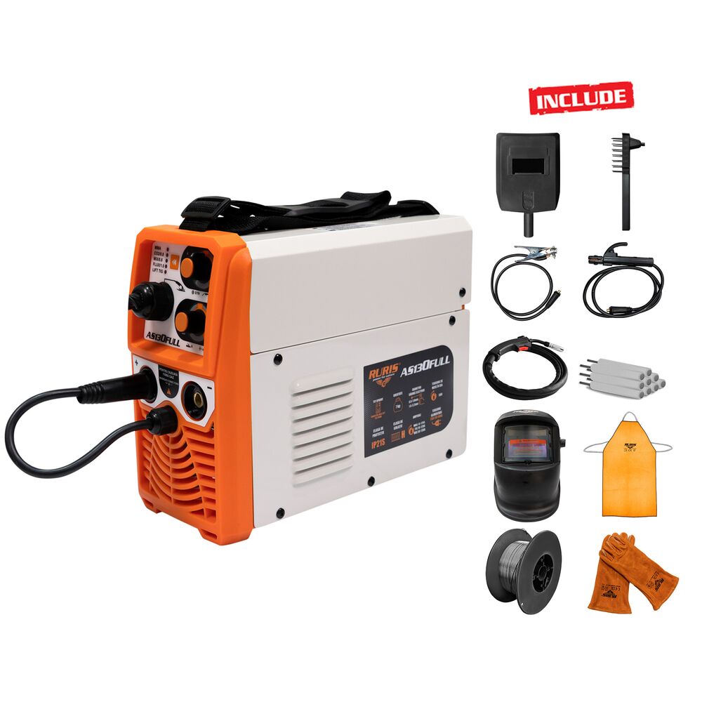 Příslušenství: svařovací maska, profesionální svařovací kukla, MIG hořák, kladivo na strusku s drátěným kartáčem, uzemňovací svorka, držák elektrod, rutilové elektrody 2,5 mm - 2,5 kg, svařovací drát RURIS flux 081, svářečská zástěra, svářečské rukavice.