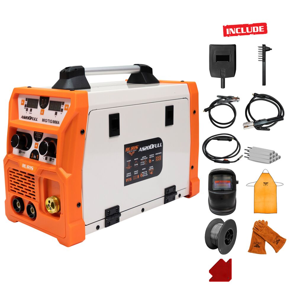 Příslušenství: svařovací maska, profesionální svařovací kukla, MIG hořák, kladivo na strusku s drátěným kartáčem, uzemňovací svorka, držák elektrod, rutilové elektrody 2,5 mm - 2,5 kg, svařovací drát RURIS flux 081, svářečská zástěra, svářečské rukavice.