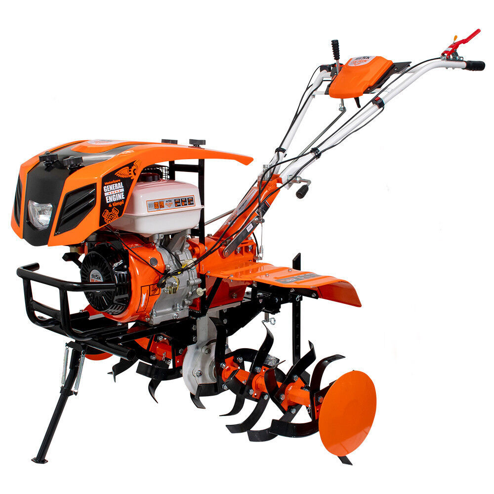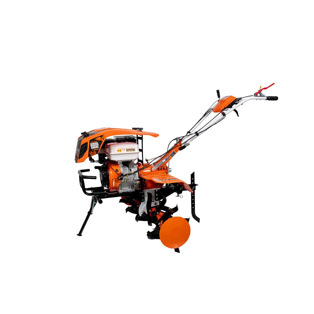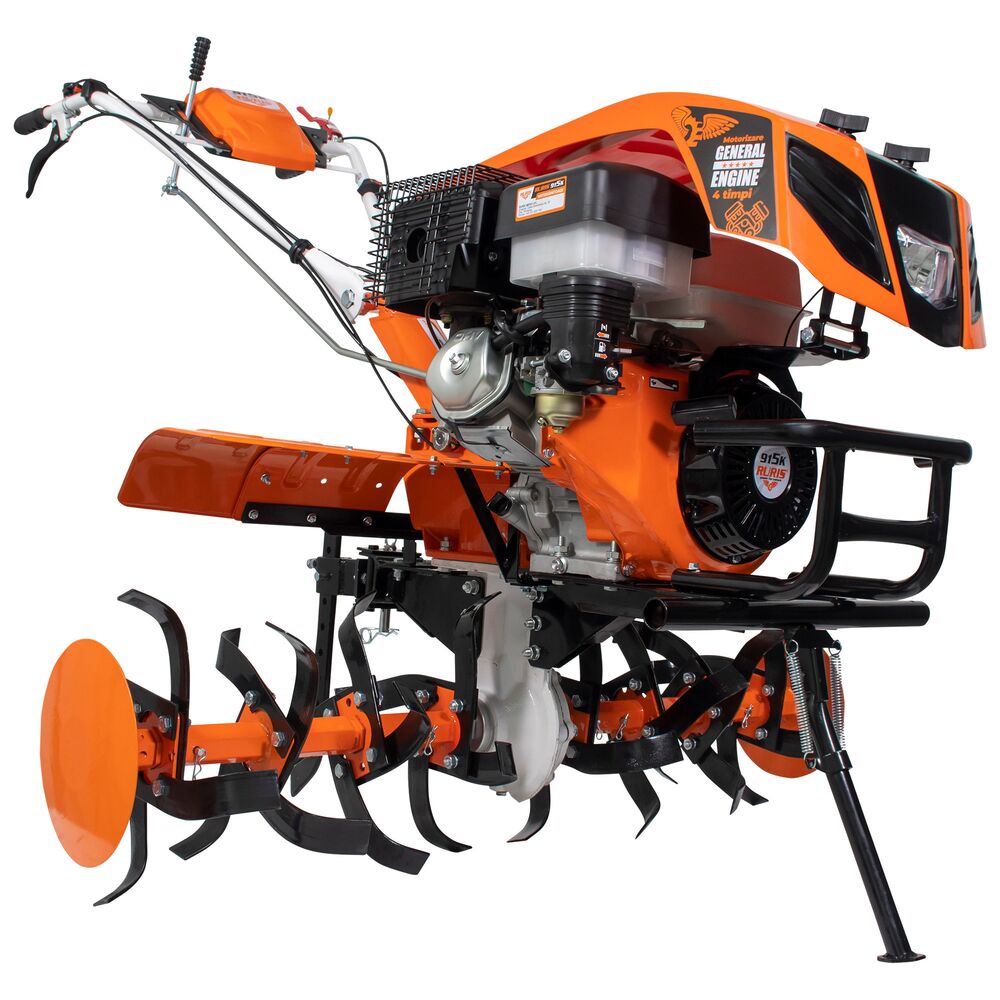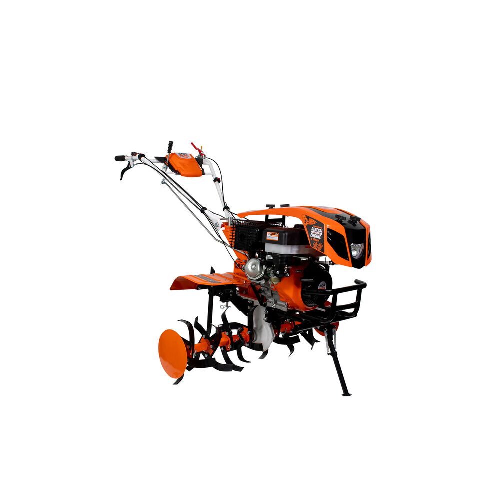 Dotaz na produkt Na splátky ještě dnesBenzínový kultivátor pro obrábění velkých ploch s motorem General Engine o výkonu 15 HP, vybavený LED osvětlovacím systémem, který umožňuje jeho použití i při zhoršené viditelnosti nebo po setmění. Pracovní hloubka může dosáhnout 360 mm a příslušenství, které je součástí balení, pomáhá při orbě, setí nebo přípravě setí. Pracuje se 3 rychlostmi, 2 vpřed a 1 vzad. Řadicí páka je umístěna na úrovni rukou, což umožňuje snadnější volbu požadované rychlosti. Skříň převodovky nevyžaduje speciální údržbu a může být použita na všech druzích půdy. Dokážepotáhnout přívěs s 1000 kg nákladem. Je vyroben z tvárné litiny, odolný vůči nárazům a mechanickému opotřebení. Dokáže zpracovat i ty nejtěžší půdy přiloženými ocelovými frézami. Snadno ovladatelný, ovládá se jednoduše díky vzhůru nastavitelným kovovým madlům a gumovým rukojetím určeným k tlumení vibrací generovaných motorem.