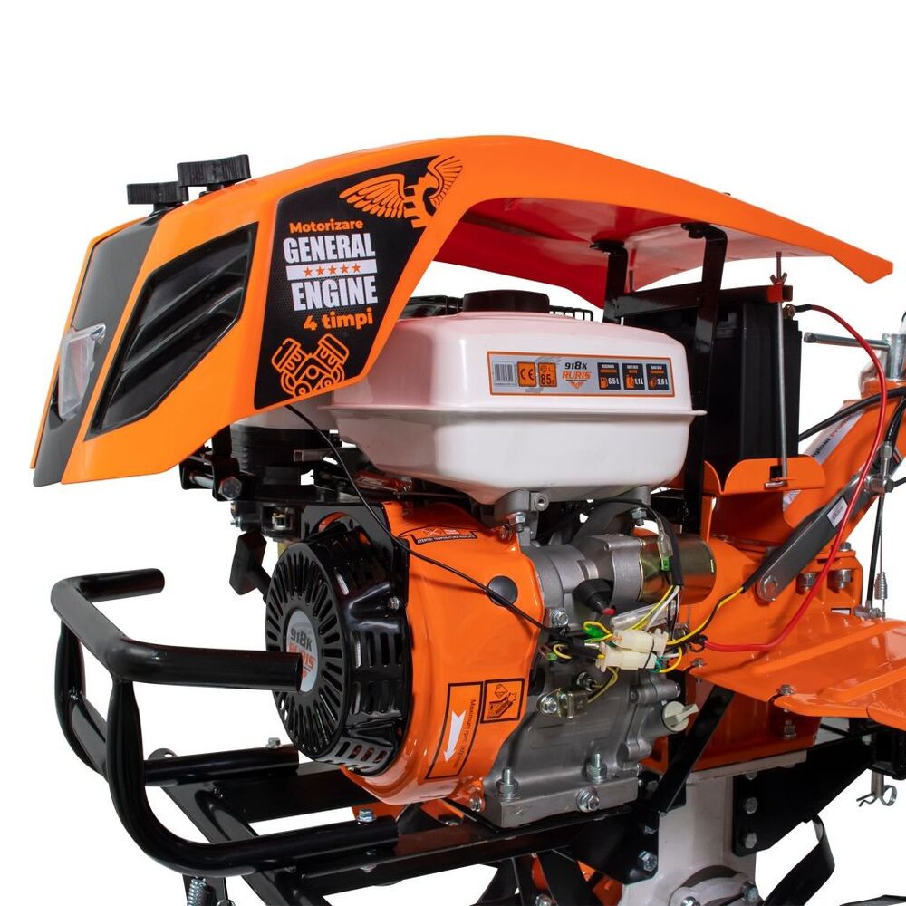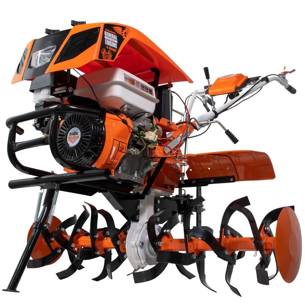 Profesionální kultivátor s elektrickým startováním na klíč. Kultivátor s motorem 18 HP General Engine a objemem válců 460 ccm dokáže bez problémů kultivovat a orat jakýkoli typ půdy bez ohledu na její tvrdost, přičemž dosahuje hloubky až 360 mm s účinností přes 1500 m2/h.